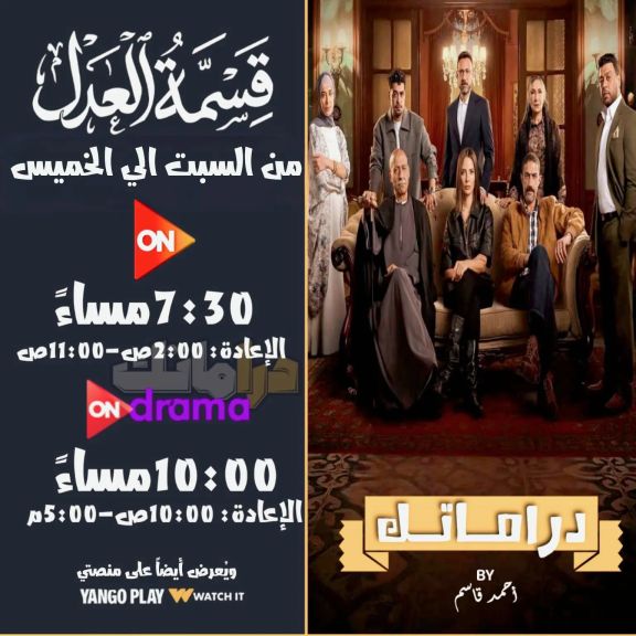 بعد النجاح الكبير الذي حققته الفنانه إيمان العاصي في سنة 2024 بمسلسل برغم القانون تدخل هذه السنه 2026 بمسلسل جديد بعنوان قسمة العدل وعرض أول له الليله علي قناة ON الساعه 7:30 مساء وعلي قناة ON drama الساعه 10:00 مساء .